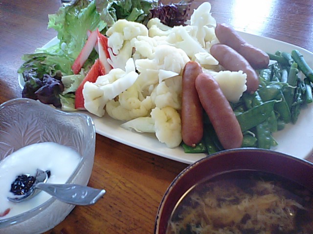 今日も頂いたカリフラワープラス我が家の 菜園で採りたての野菜です。 ニラたまのお汁とブルーベリー入りの ヨーグルト。 新鮮かつ健康食が毎朝続いていま〜す。