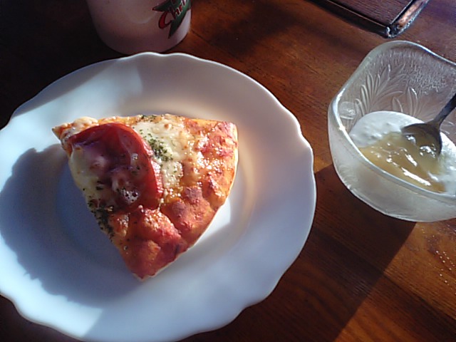 今日はタバスコたっぷりのピザの朝食。