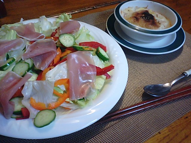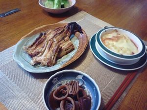 2017年8月21日blogyoko いつもより品数少なく お昼を食べ過ぎたので夕食はずっと時間を ずらして私はホタテのグラタンとサラダ。 あなごとイカの煮付けが相棒用。 グラタンの中に湯向きしたミニトマトが 入っています。 それが予想外に美味しいです。 いつもより品数少なくして正解でした。
