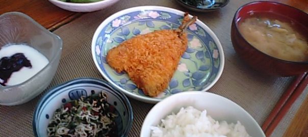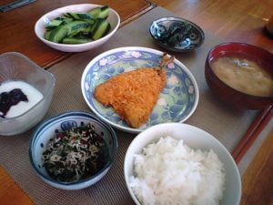 2017年8月10日blogyoko 緑一色 昨日野菜ばかりの朝食に飽きた相棒へ 今日はアジフライと梅しらすを加えて。 アジフライ好きなので今朝は満足のようでした。 私は毎日、ダシと漬物ばかり。 お腹の中、きっと緑一色で〜す。