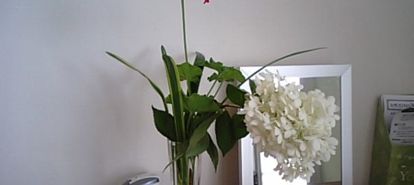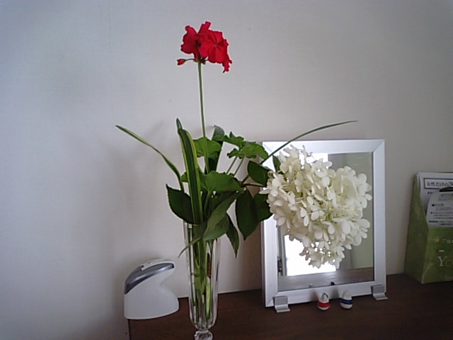 2017年8月8日blogyoko あと少しですが Sさん宅の最後のアジサイだそうです。 白いアジサイと赤のゼラニューム、緑の葉。 素敵ですよね。 夏期休暇に入るまであと少しですが、 楽しませていただきます。