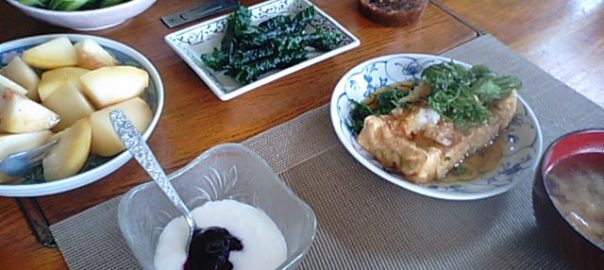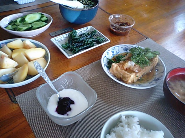 2017年8月7日blogyoko また1週間の 6時からの撤去を終えて、今度は老人クラブの 視察の予定を役員さんへ案内です。 やっと終わり8時近く朝食。 今日もすでに2時間町内会の事で走り回って います。 普段、運動不足の相棒。 ちょうどいい運動になっているかも。 今日も緑ばかりの内容ですが、美味しく いただいてきました。 また1週間のはじまりです。