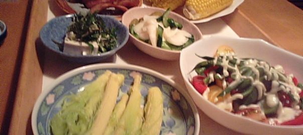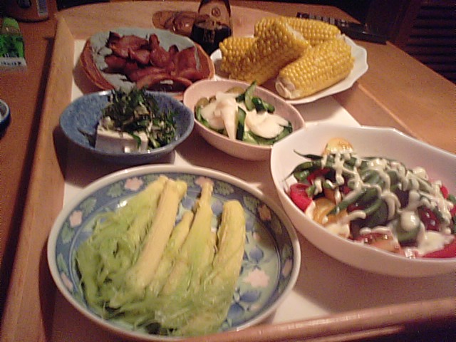 2017年8月25日blogyoko 時間も経費も 昨夜の夕食。 ほとんど、料理らしい物なし。 今、我が家は豚トロを塩胡椒して炙って、 わさびで食べるのにはまっています。 その豚トロ炙りすぎて茶色! 相棒はそれでも美味しいらしい。 あとは金のとうもろこしとベビーコーン。 冷やっこに漬物とサラダ。 火をかけて味付けした物がほとんどなし、 時間も経費も殆どかかっていませ〜ん。
