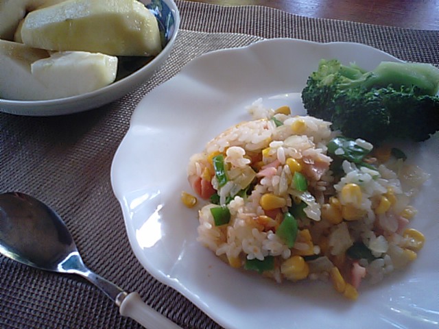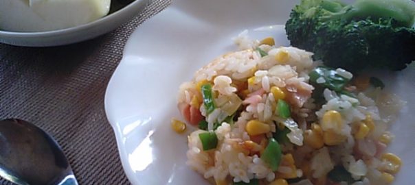 2017年12月6日blogyoko いつも残り物 今日の私の朝食。 一握りのご飯にタマネギやコーンを入れて チャーハンです。 これで一膳ぐらいにかさ上げです。 ラフランスも1個剥いても1/4個食べたら お腹がいっぱい! ラフランスも夕食まで持ち越しです。 だから、いつも残り物ばかりになって しまう我が家で〜す。