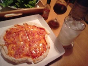 私はベーコンピザとワイン&サワー。