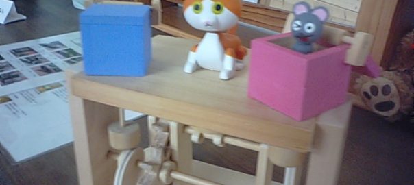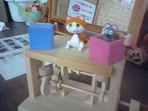 2018年3月5日blogyoko 第3弾 第3弾、からくり人形登場です。 今回は猫とねずみです。 ピンクとブルーの箱から次々ねずみが顔を だします。 会員さんのKさんのご主人作です。 いつもながら、この細い作業全て手作業で 一から作るそうです。 関心するしかないですね。