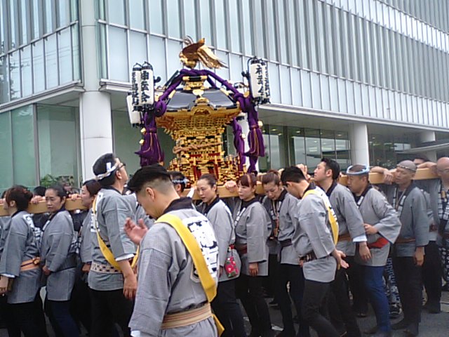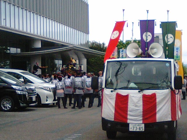 2018年5月18日blogyoko 大祭 ブルーノから帰る途中に独特な演奏が 聞こえてきました。 湯殿山の大祭です。 山新の広場から今くりだすところです。 知り合いが数人いて、先頭にいる方と 挨拶していたら、YTSの取材でカメラが。 私はその場をスーと抜けて相棒のみが 取材を受ける事に。 夕方のニュースに出るかも、、、。