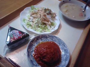 2019年2月14日blogyoko アンバランス 塩びきの有力情報を会員さんからゲットです。 とあるスーパーの棚の上に少しはあると! ユーフィットが終わったとスーパーへダッシュ。 ですが、やはりありませんでした。 遅くなったわけでないのに玄関に明かりが。 予定外に町内の会合が早く終わったと相棒が 先に帰宅です。 下ごしらえしてあった料理を温めるだけ。 本当は煮込みハンバークの脇にはパスタの 予定がスーパー特売のおにぎり。 トマトで煮込んだハンバーグが好評です。 でも並べてみるとアンバランスの夕食でした。