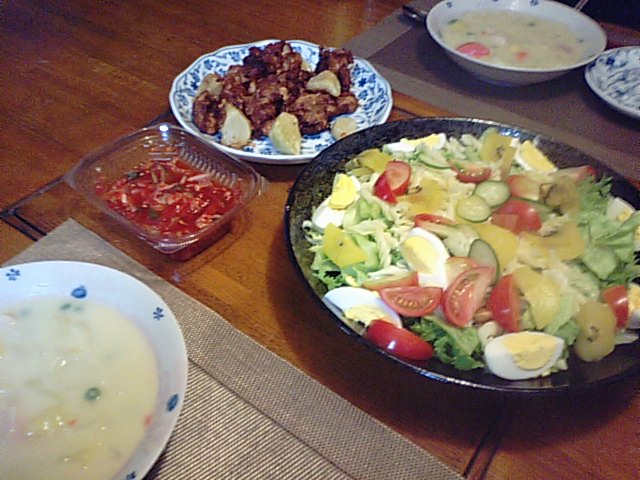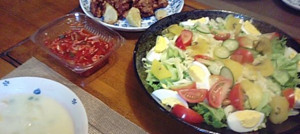 2019年3月25日blogyoko サラダ 日中から粉雪が舞っていて寒いです。 どこにも出かけたくない状況です。 唐揚げとシチューを作っただけ。 オリーブ油と塩コショウ、ドレッシング、 マヨネーズなどで味を変えてのサラダ メイーンの夕食で〜す。