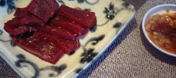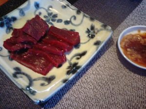 2019年5月20日blogyoko 超美味しいらしい 5時過ぎには予定していた事すべて終わり さっぱりとお風呂です。 ある材料で焼肉。 そして鯨のお刺身。 超美味しいらしくビールがゴクゴクです。 ビールの次は焼酎。 飲み口が良く、ついついでした。