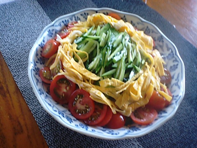 2019年7月16日blogyoko タップリの 散歩が終わったら畑で収穫です。 菊の葉に大きなトンボです。 半日暑い中で作業をしたら、とにかく すごい汗です。 冷やし中華ではなく冷やしそーめん。 タップリの酢とタップリのラー油で 生き返りました。