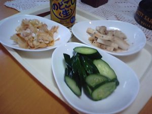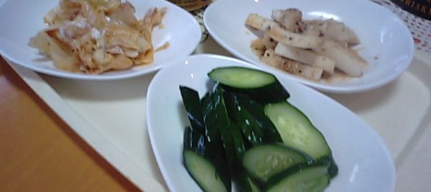 きゅうり漬け、大根のネギ醤油和え、キャベツの