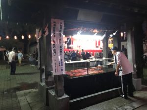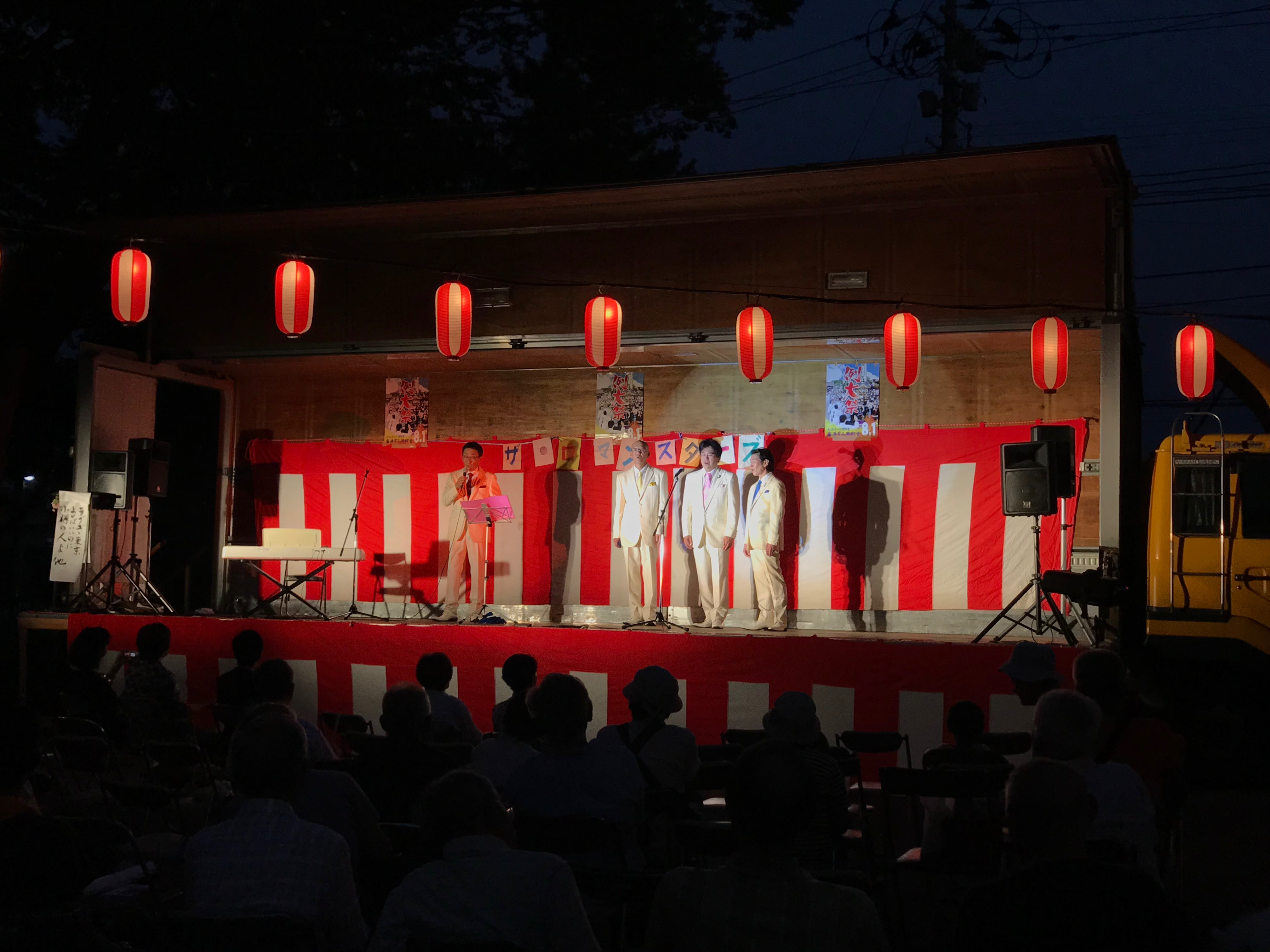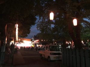 2019年8月1日blogyoko 前夜祭2 ユーフィットの看板やのぼり旗を片付けるため 外に出たら夕焼けです。 片付けたら、ちょこっとだけ両所の宮へ。 ステージの前にはたくさんの人です。 でも、見たかったのは神輿担ぎの人たち。 今日、本祭なのでまた挑戦で〜す。