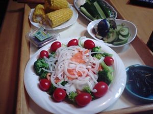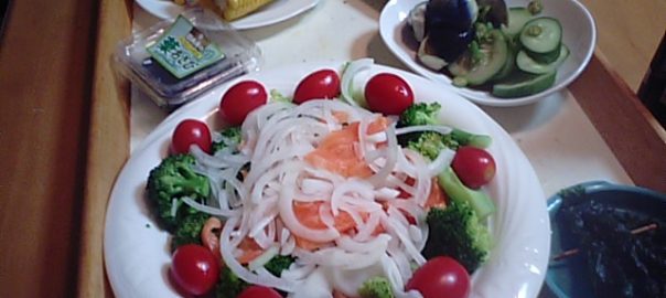 2019年8月26日blogyoko 野菜だけ 定時少し前にユーフィットをでて信号待ち。 そこへ電話です。 スタッフSさんから鍵を忘れた! で、ユーフィットへ引き返し施錠。 結局、通常の時間帯で帰宅です。 野菜たっぷりのサーモンサラダ。 そしてサーモン以外は野菜だけ。 夕食、美味しくいただきました。