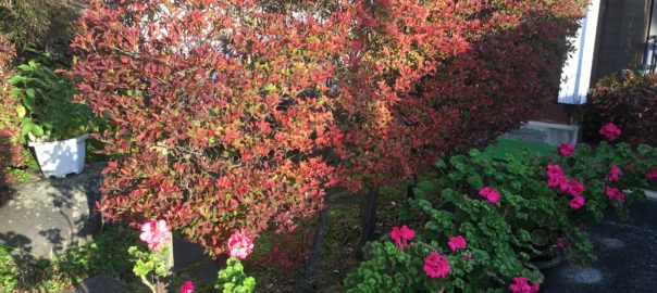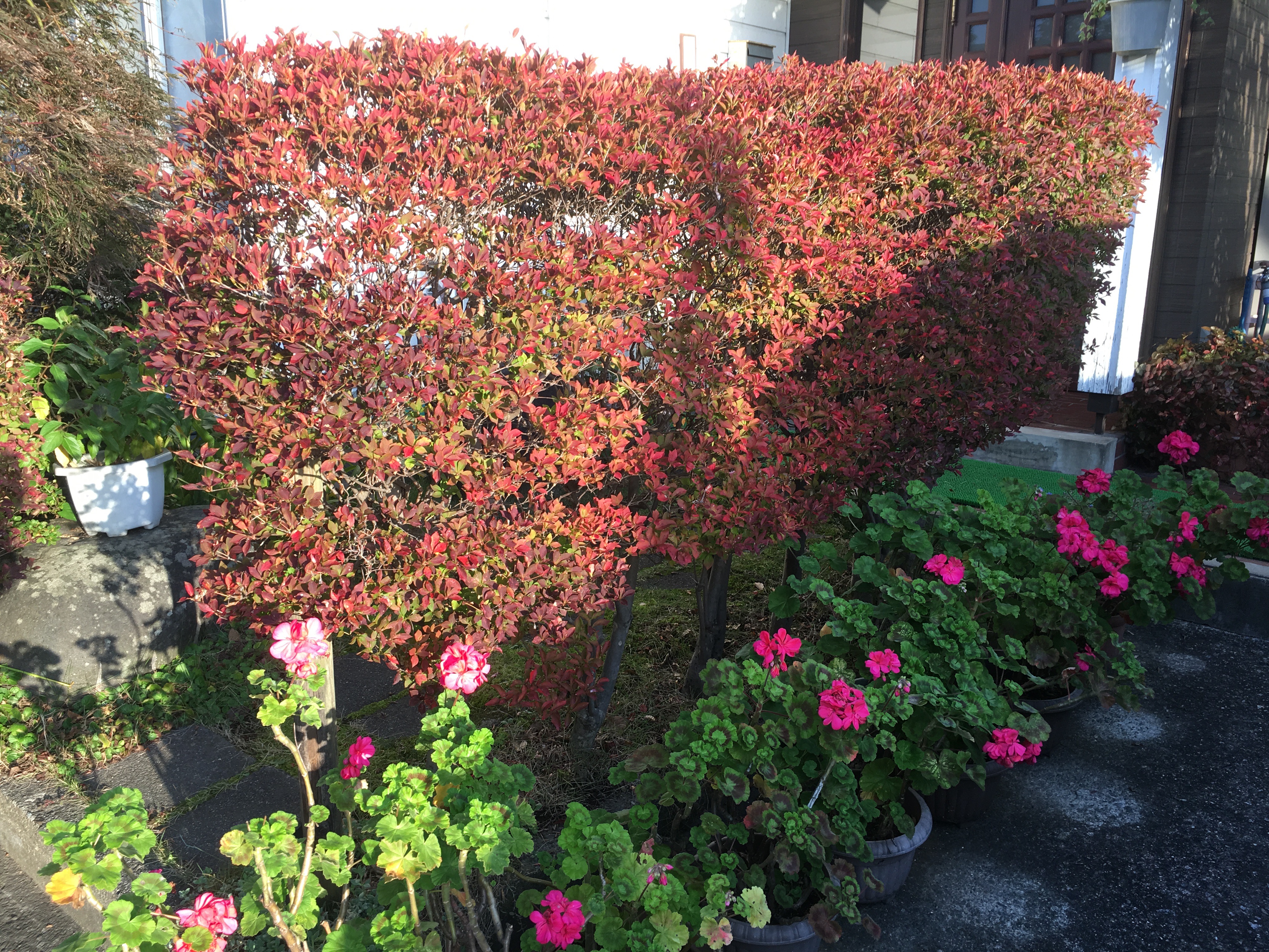 2019年11月1日blogyoko 片付け物で 我が家の垣根も紅葉してきました。 でも今日はこれから雨。 時期に葉が落ちてしまいます。 鉢植えもそろそろ家の中です。 この連休も片付け物で大忙しに なりそうで〜す。