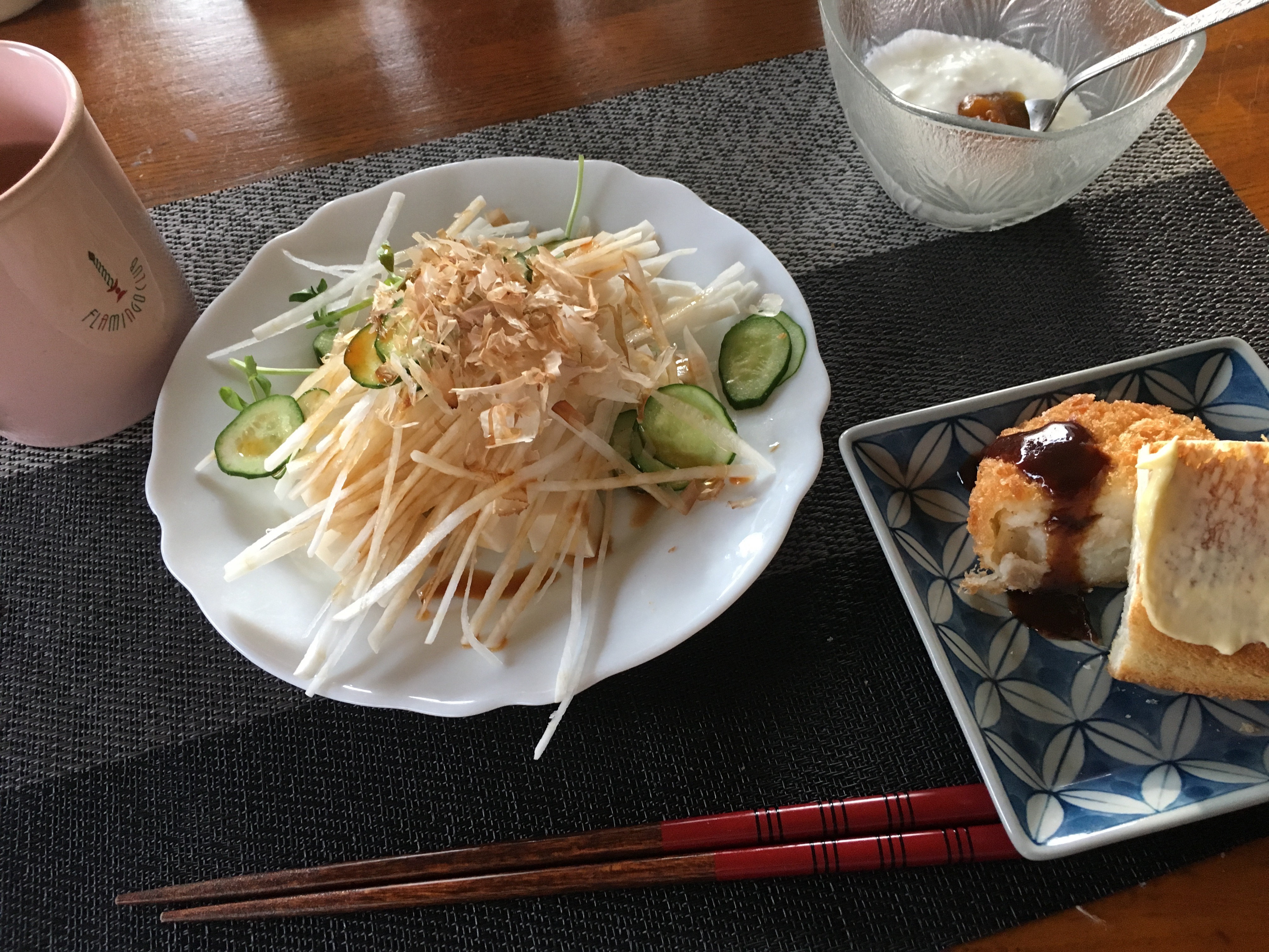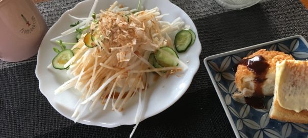 2020年3月5日blogyoko 気持ちが 今朝の朝食はお豆腐と大根のサラダ。 そして残っていたクリームコロッケと食パンを 少しづつ。 中々、ダイエット効果が見られませんが、 Aさんの頑張りを見ていると気持ちが折れては また立て直しの日々で〜す。