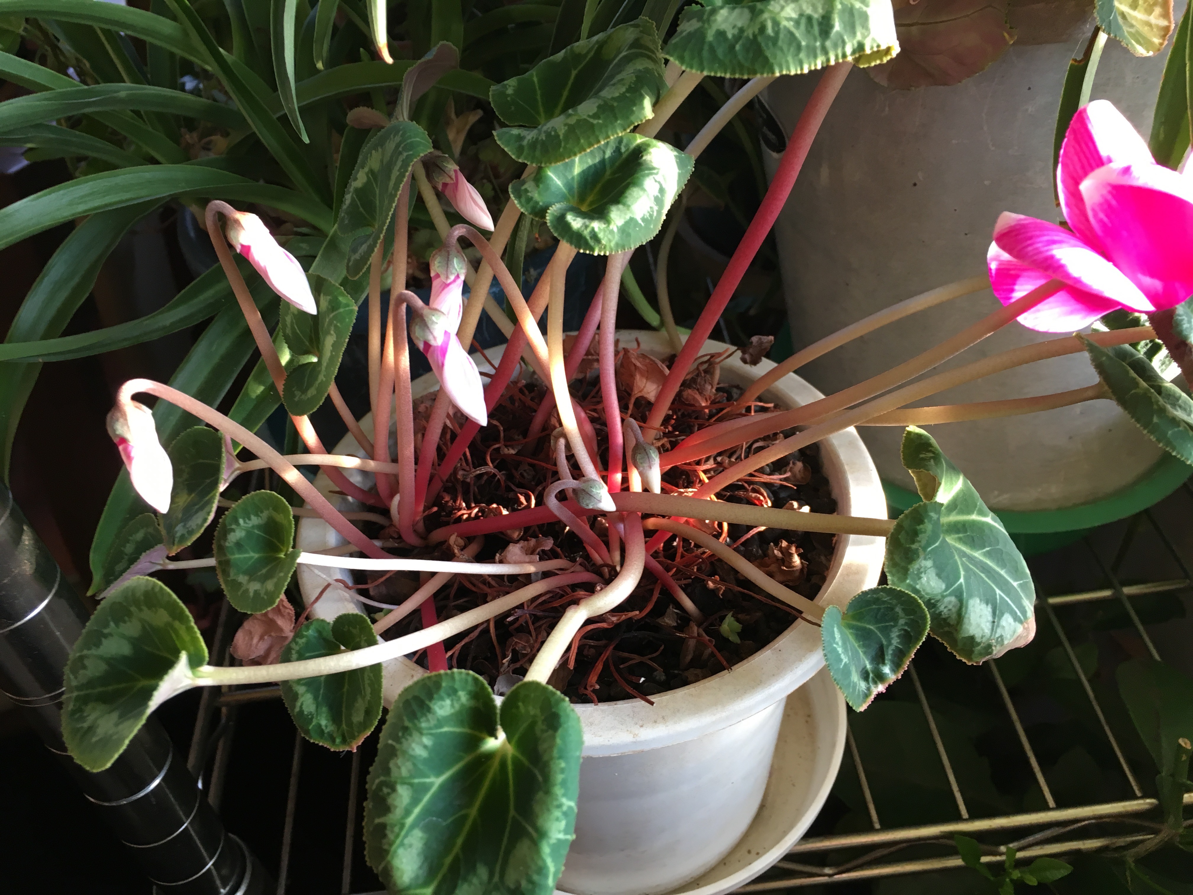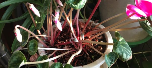 シクラメン明るいところに移動です。 花芽をたくさんつけていました。 でも暗いところに置いていたので モヤシ状態。 今から頑張ってくれるかどうか???