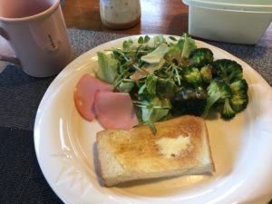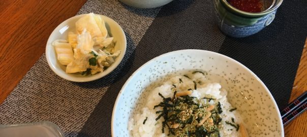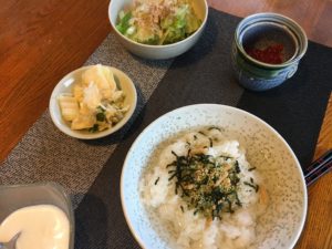 私の朝食。 二日酔いの相棒はお茶漬け。 シャキシャキウルイが美味しいのか やっと目覚めてきたようで〜す。