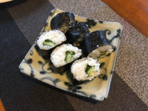 3月3日お雛様。 何も準備していなかったので、急遽 きゅうりとシソを入れた海苔巻き。 巻きが下手すぎで〜す。