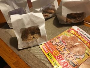 2020年3月23日blogyoko 女川へ 土曜は半分仕事で女川へ。 途中、ピリ辛チキンとお水で休憩。 震災から9年たって、オープンしたスーパーを 見学です。 その後、ハマテラスへ 1時も過ぎたので昼食。 注文も行列です。 あまりの混みようで注文してから手元に きたのは2時、女川丼1300円。 私は相変わらず天丼957円。 自分用にお土産イワシ500円を購入して 帰宅で〜す。