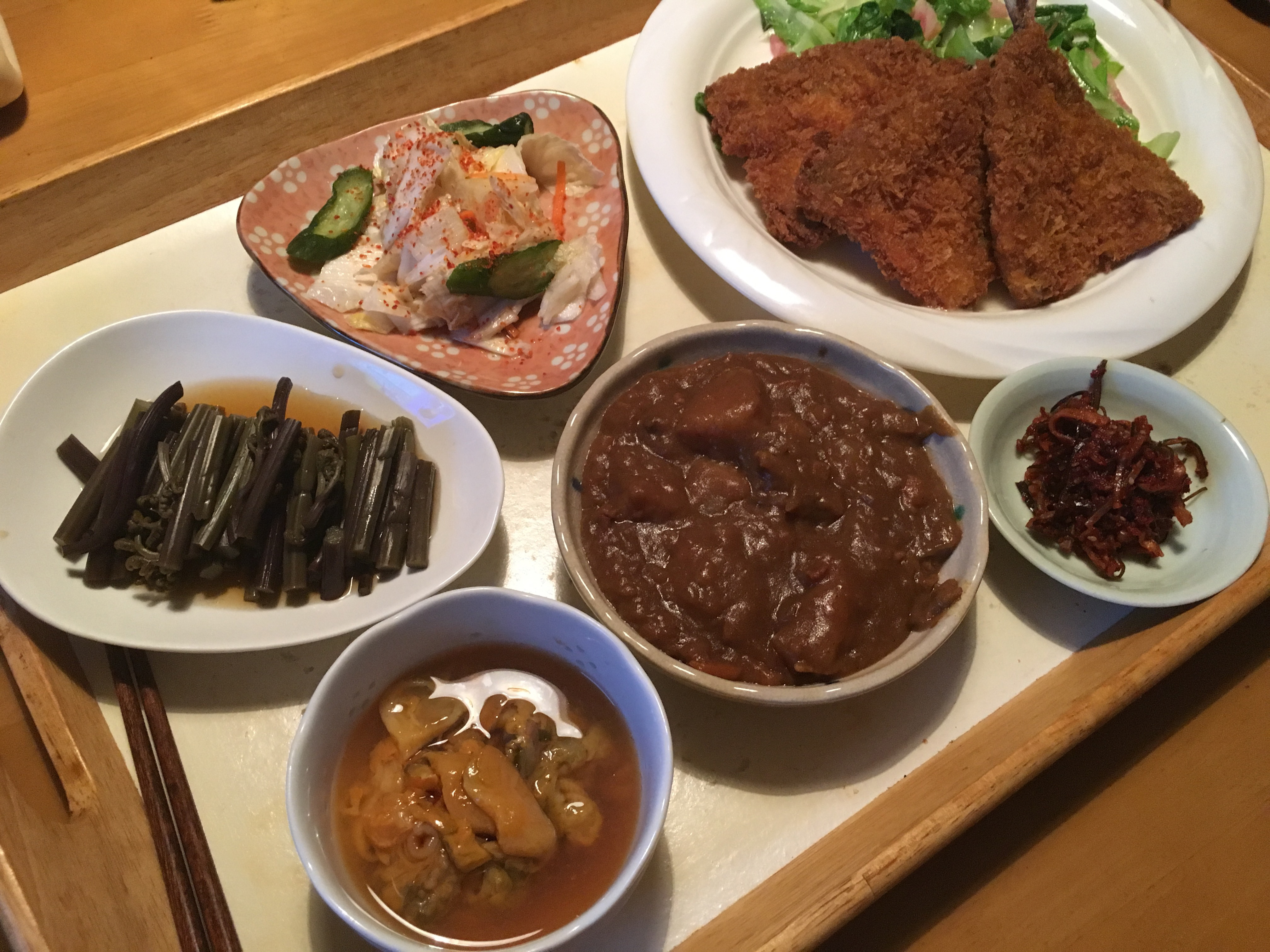 昨夜はアジフライとほや。