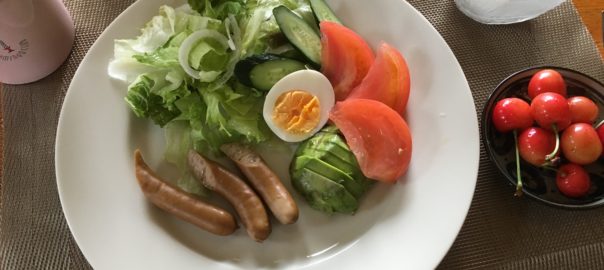 2020年6月19日blogyoko 週末 散歩から戻りさくらんぼ付きの朝食です。 毎日同じ内容ですが、飽きしない自分が います。 生野菜大好きだからでしょうね。 でも、今日はアボカドがイマイチ。 週末、Aさんから教えてもらったので 冷凍アボカド購入に行ってきま〜す。