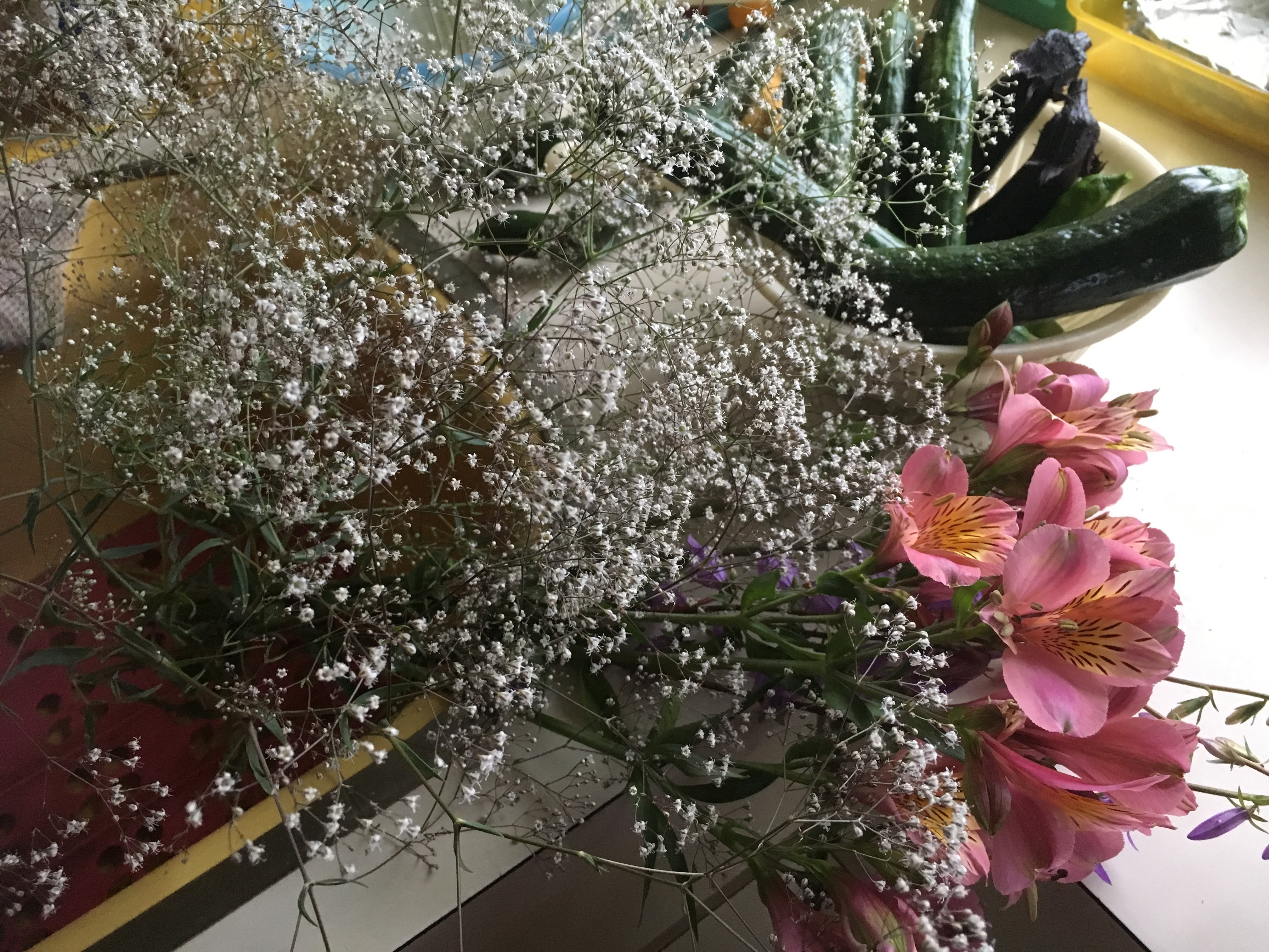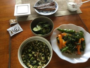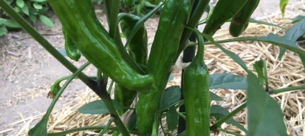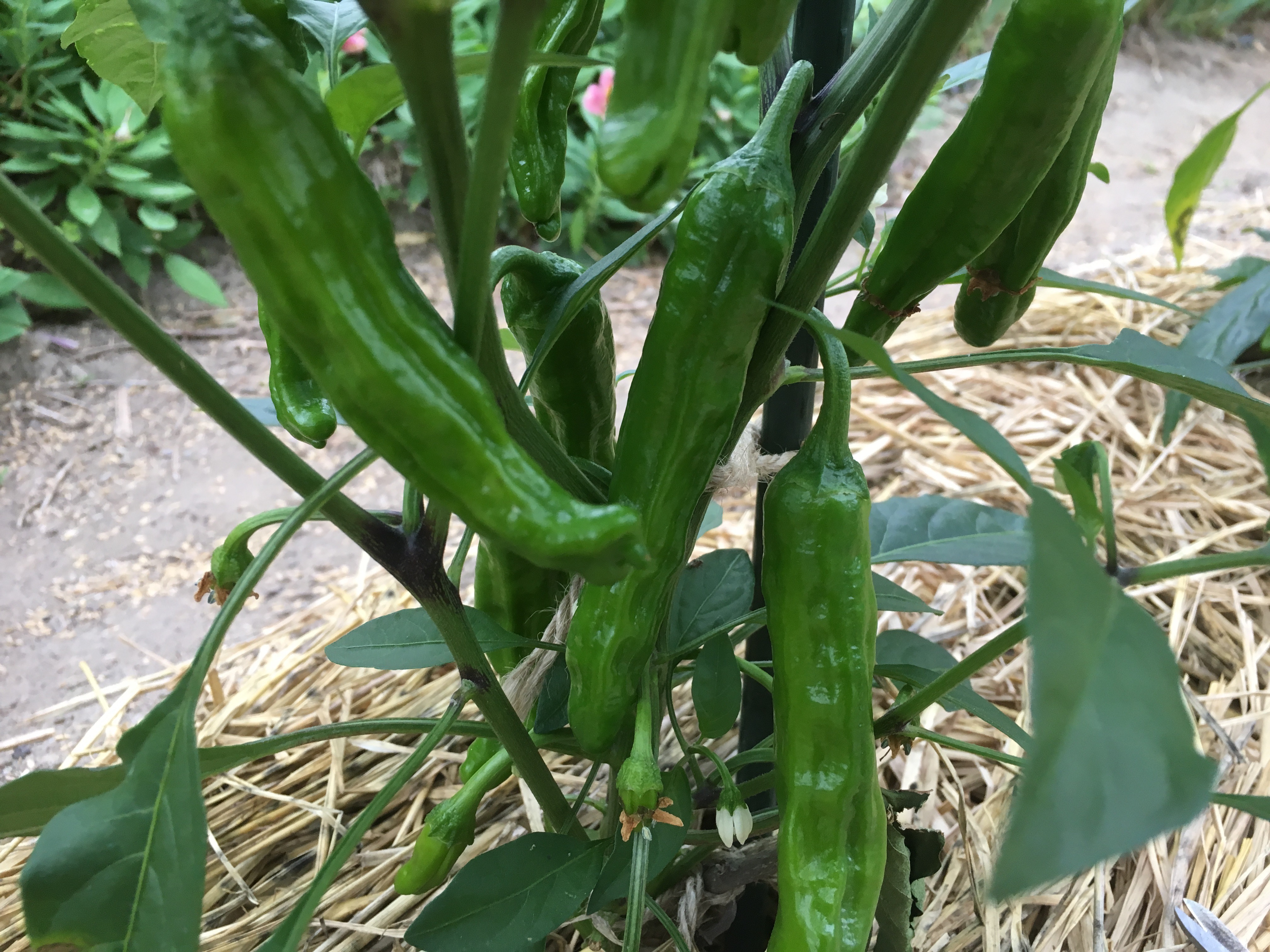 2020年6月23日blogyoko 今日も 万願寺が大きくなってきました。 今日は少しだけ収穫です。 名前の分からない花を切って かすみ草と合わせて飾ります。 今はきゅうりとズッキニーが豊作なので 今日もダシ作り&素揚げで〜す。