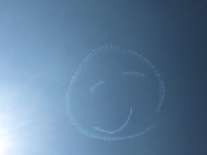2020年8月21日blogyoko スマイル 山新の空に描くよスマイルの記事を読んで 少しでも高いところで20分前から待機です。 考える事は皆同じで次々車が集まってきました。 音はするけど、、、。 12時30分ちょうどにスマイルマーク発見です。 あっという間に消えてしまったけど、ちょっと だけスマイルになれたかもで〜す。