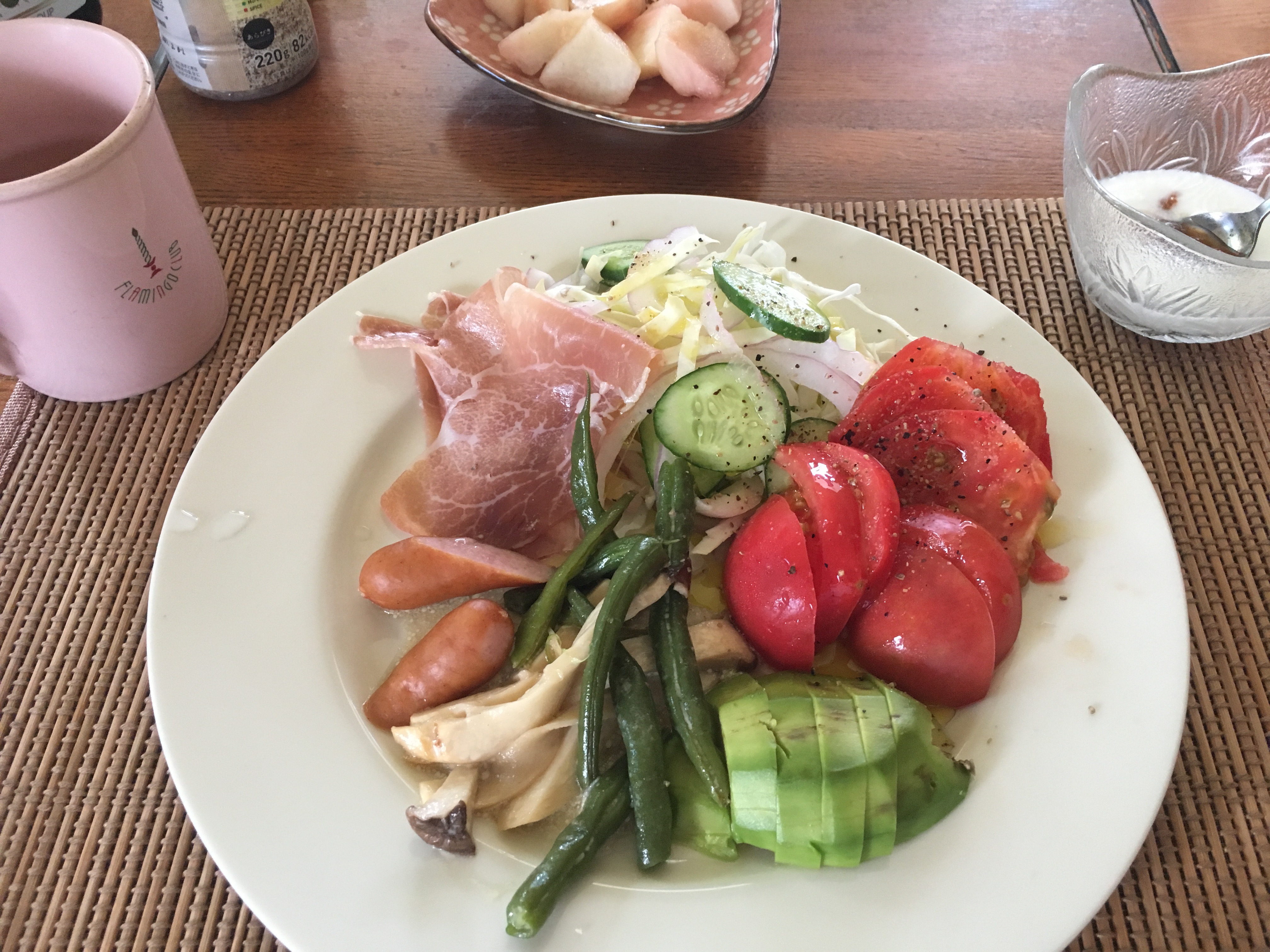 2020年8月24日blogyoko 1ヶ月ぶりに 土曜の朝食は久しぶりのご飯抜きの 野菜だけ。 こんな内容が一番好きです。 あまりに早い目覚めで8時前に掃除、洗濯、 畑での収穫等全て終了です。 1ヶ月ぶりにスタッフのWさんがシフトに 入るので、トレーニングはもちろん おしゃべり兼ねてユーフィットへ行くのが 楽しみで〜す。