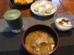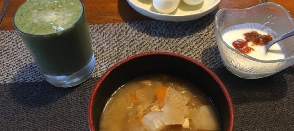 2020年12月3日blogyoko ゆで卵 野菜たっぷりの味噌汁と小松菜とバナナの ジュース。 タンパク質の摂取を考えてゆで卵付きの 朝食です。 でも、お腹いっぱいで食べられず、 ゆで卵はお昼ご飯で〜す。