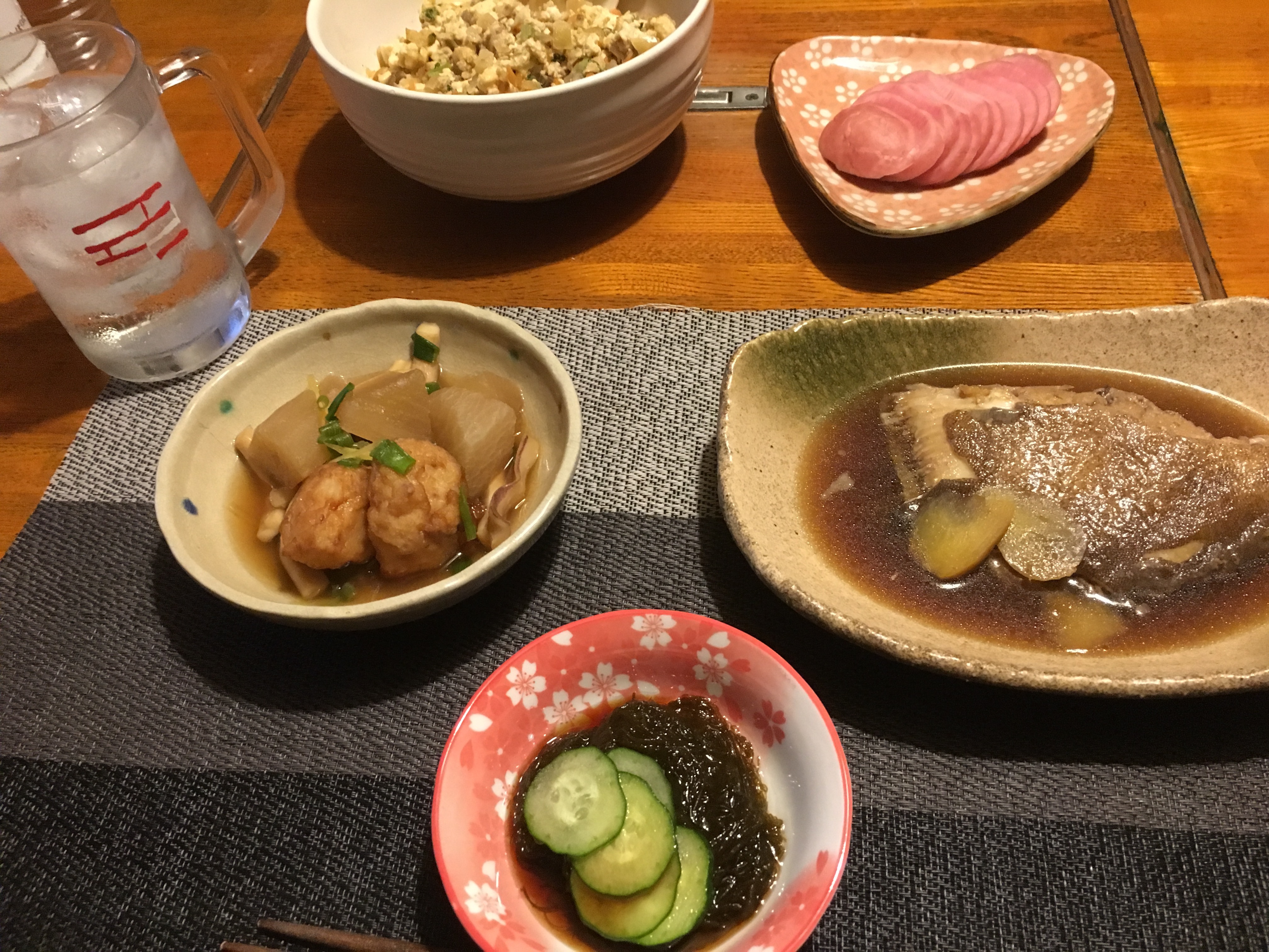 2021年1月12日blogyoko 食事半端で お肉が続いたので久しぶりにお魚。 ナメタカレイの煮付け、大根とイカとつくねの 煮込み、もずく酢と赤カブ&豆腐炒り。 煮付けは半分も食べられず相棒行き。 その分、赤カブ漬けはぺろりです。 あっ!。孫ちゃん達からテレビ電話。 食事半端でたくさん癒された時間になりました。