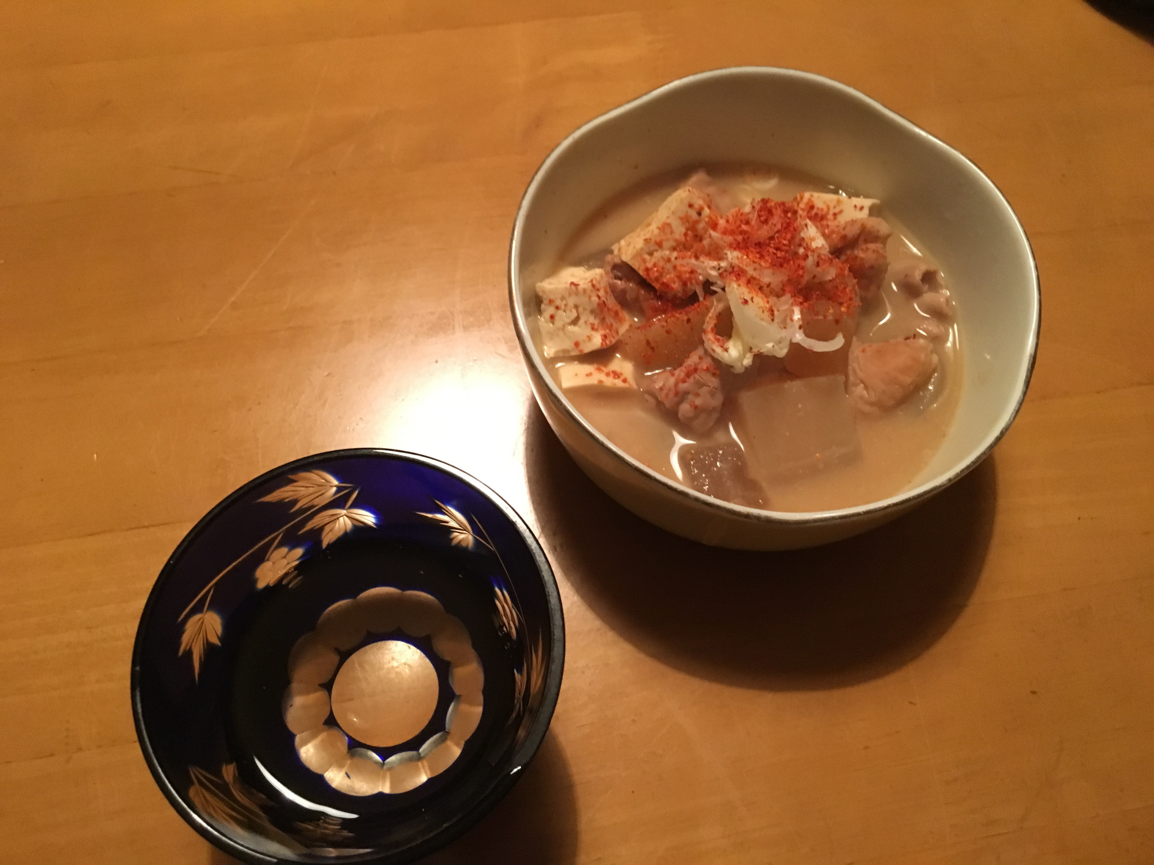 相棒は自分で作ったモツみそ煮込みのみの