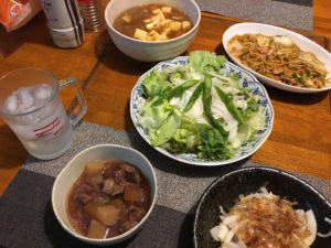 2021年4月12日blogyoko そのまま 買い物もほとんど終えて、もう少し畑を しようかと思いましたが、やはり若くは ないから無理は禁物で二人でゴロゴロ。 早めの夕食です。 相棒作の煮込みと我が家のアスパラのサラダ。 あとは失敗作のキムチで焼きそば。 そして麻婆豆腐でしたが、ランチが遅かった こともありで麻婆豆腐はそのまま手つかず で〜す。