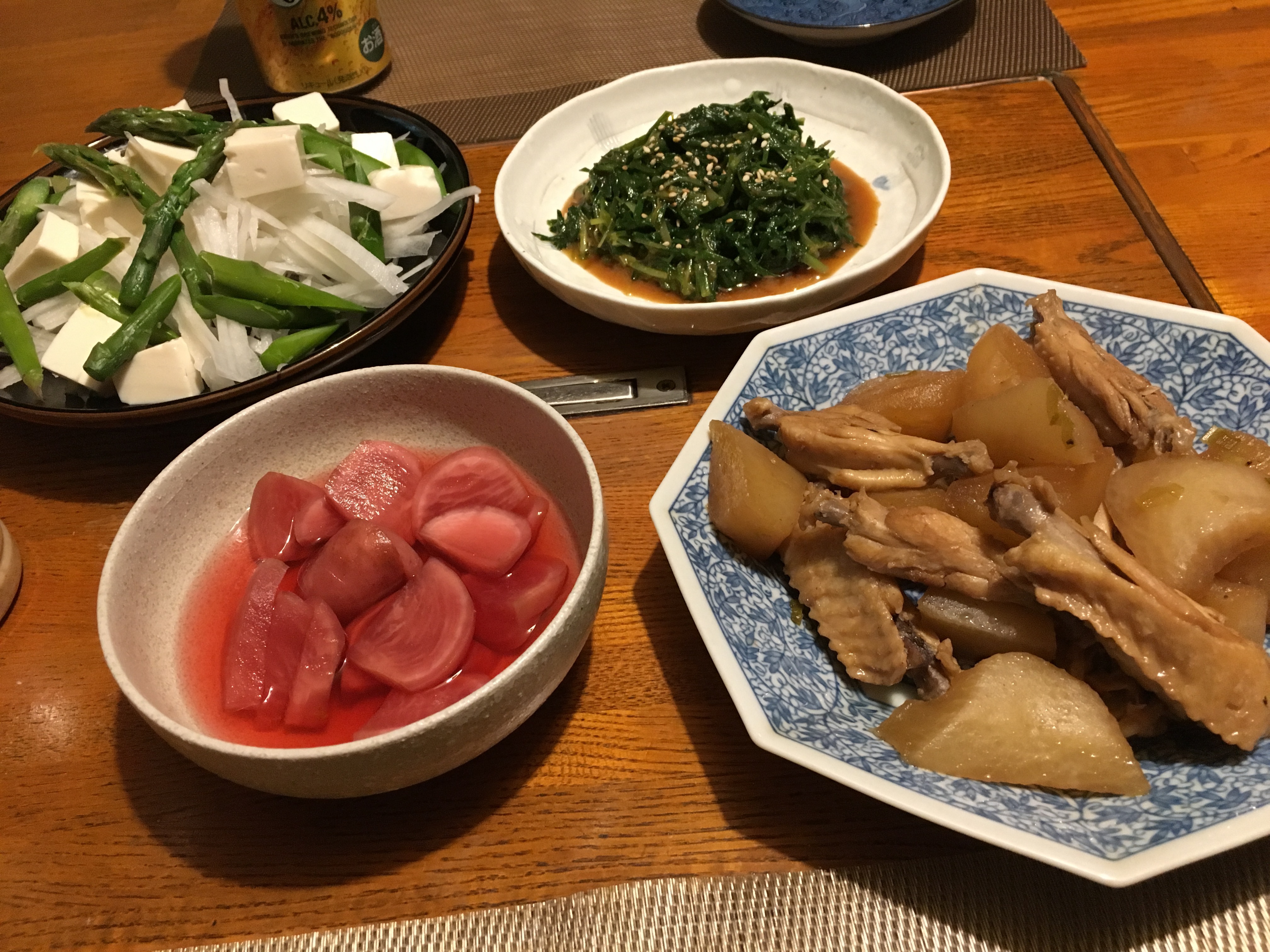 2021年4月26日blogyoko 海鮮丼 夕方から、もう少し畑作業をと思って いましたが、腱鞘炎気味です。 無理せずに明日することに。 朝、耕運機で傷をつけてしまった大根と 鶏肉を煮てみました。 あとはアサツキの酢味噌。 メインは海鮮丼で〜す。