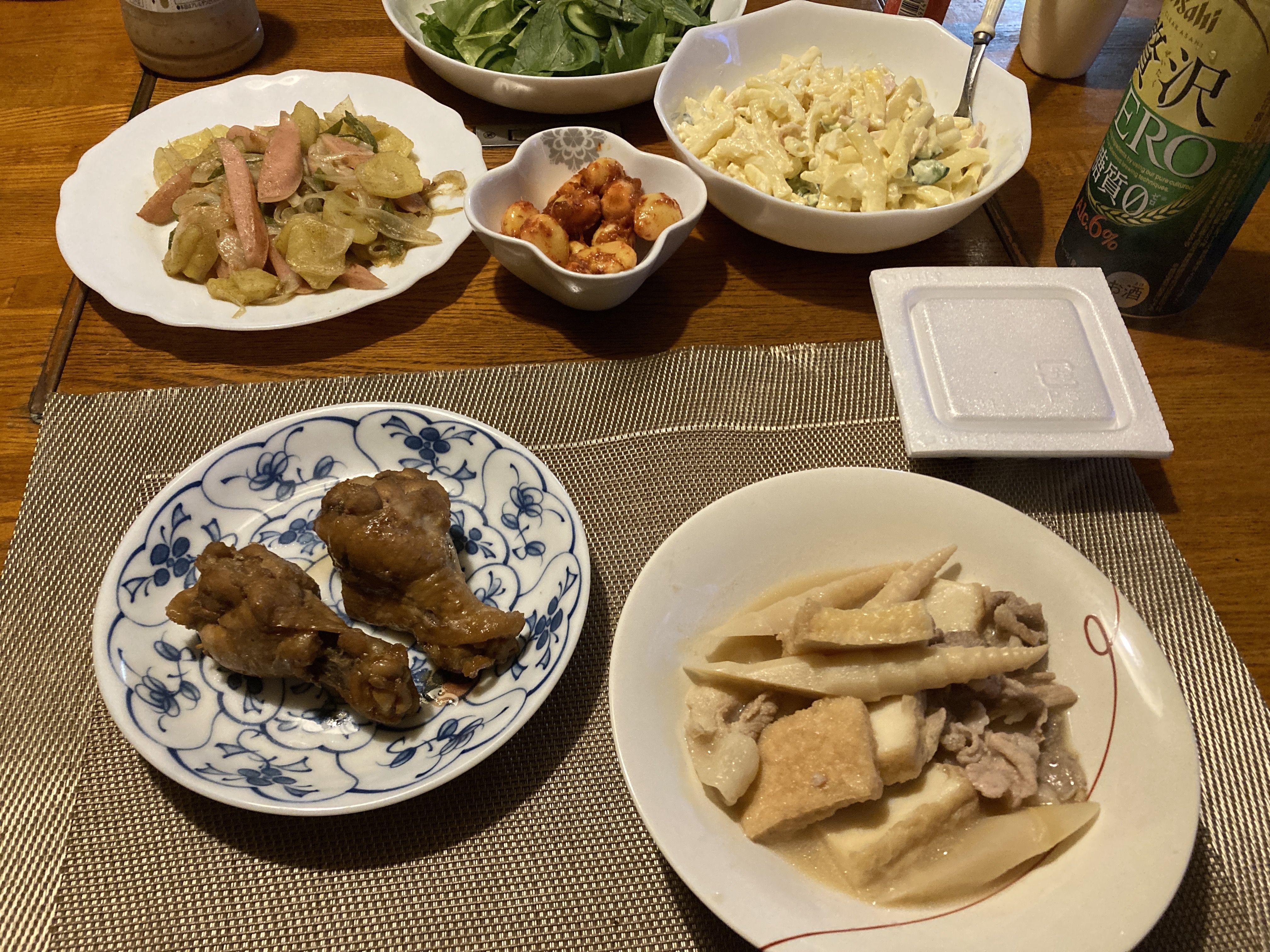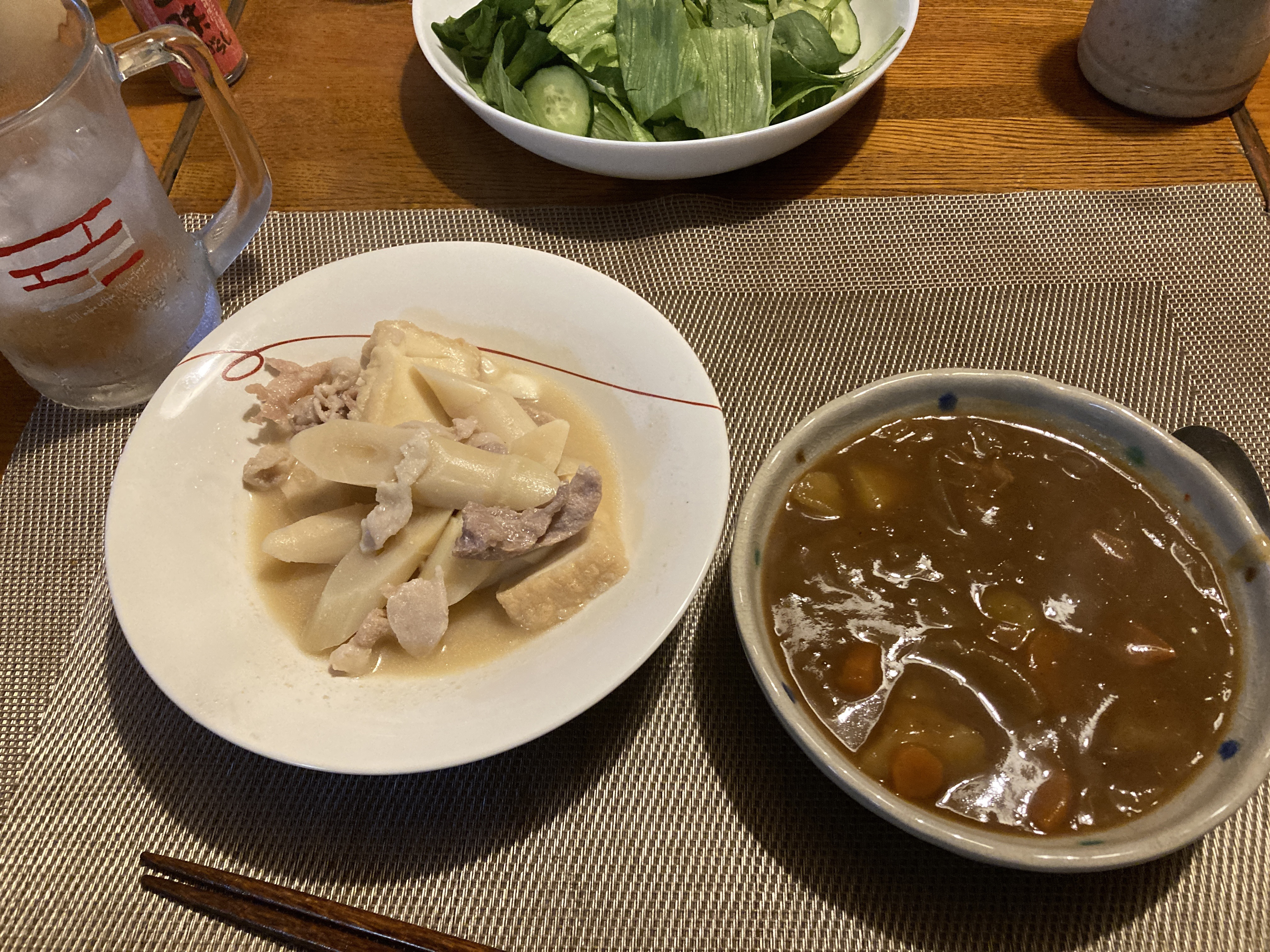 2021年6月21日blogyoko 2回目は 土日はしっかり仕事のはずが午後から出かけた にもかかわらず。いつもより早めの夕食。 やはり体がだるいそうです。 細竹と厚揚げの汁物だけ食べて終了です。 おかずがほとんど残ってしまいました。 お酒もほとんど飲みません。 私は別メニューでカレーを追加。 お酒は普通に。 二人とも同時にワクチン接種しているのに 副作用がでる人とでない人がいるんですね。 2回目は要注意で〜す。
