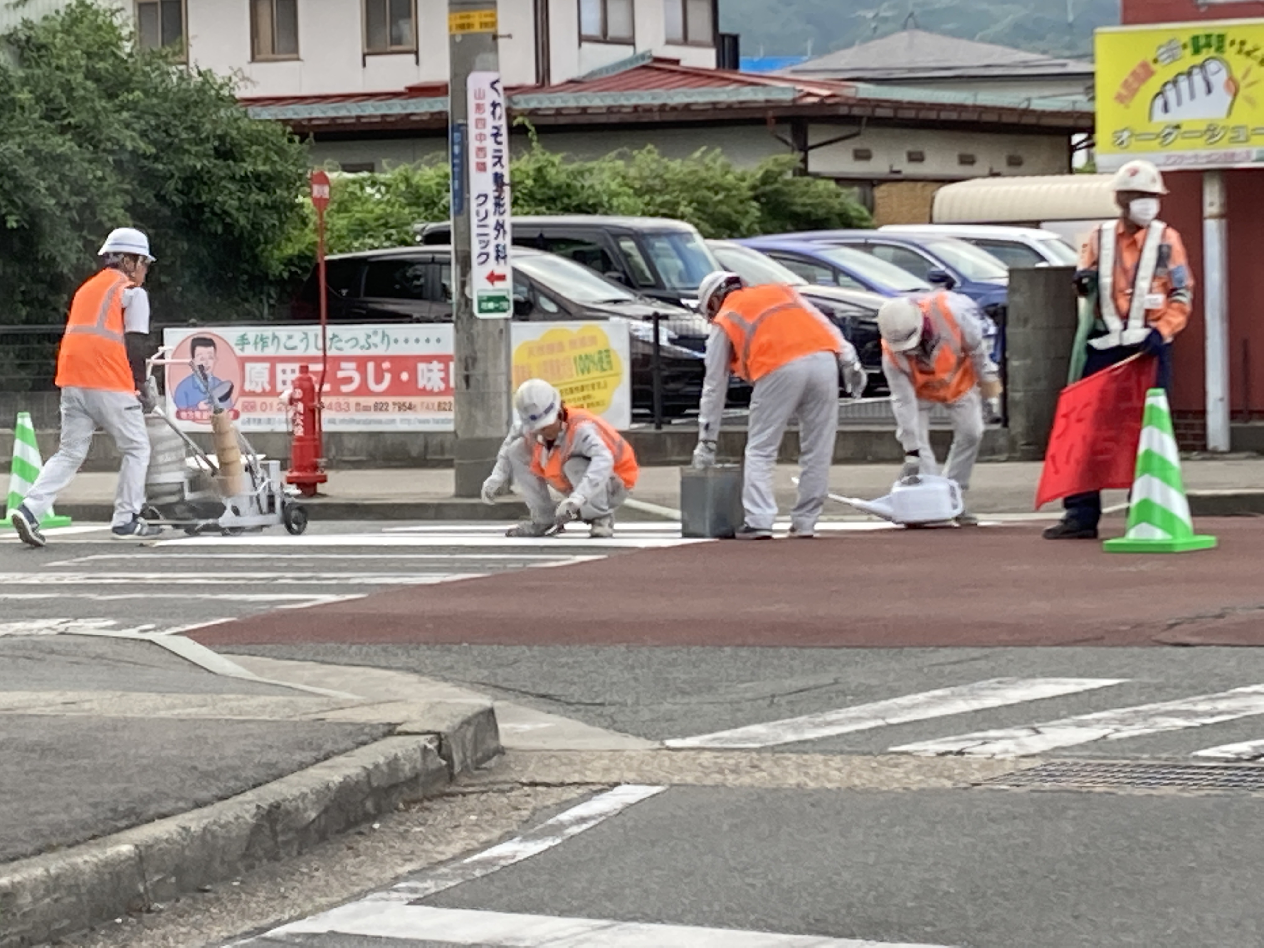 2021年6月17日blogyoko 感謝 自宅近くまで戻ってきました。 横断歩道の白線引きをしています。 まだ6時前なのに。 交通量が多くならないうちにでしょうね。 それにしても散歩をしていなければ、 こんなに早くから作業をしているなんて わからない! 目に見えない所で作業されている方達に 感謝で〜す。