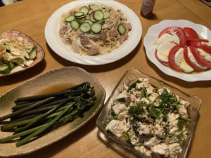 2021年6月8日blogyoko 拒否 二日サボったので昨夜はジムへ。 トレーニングは軽〜くです。 ユーフィットでも汗を流すという事は ほぼなかったので、無理せず体を動かす 事に重点を置いています。 それとRさんやKさんとのおしゃべりが ジムへ行くお楽しみです。 夕食は豆腐とみつぱ&塩昆布のサラダ ニンニクと玉ネギ、シーチキンの冷製パスタ さすがにワラビの1本漬けは続きすぎて 相棒から拒否で〜す。