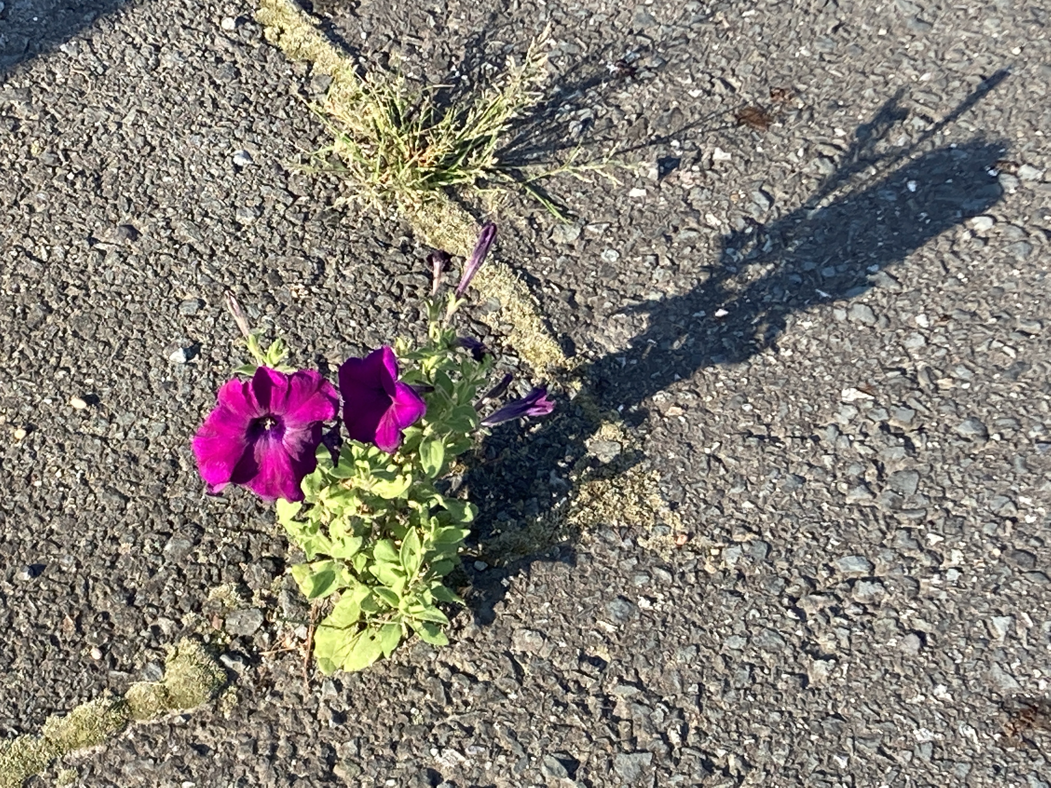 2021年7月27日blogyoko 一瞬、火事と 連休最後の日は、いつものコースの朝散歩。 焦げ臭い匂いが??? 一瞬、火事と思いましたが、誰も騒いでいないし この辺は農家さんが多いから何か燃やしている でしょうね。 階段の上で運動している方がいたのと日陰の 土手の下を歩く事に。 ど根性花です。 毎日、歩いているのに体調の変化なしで〜す。