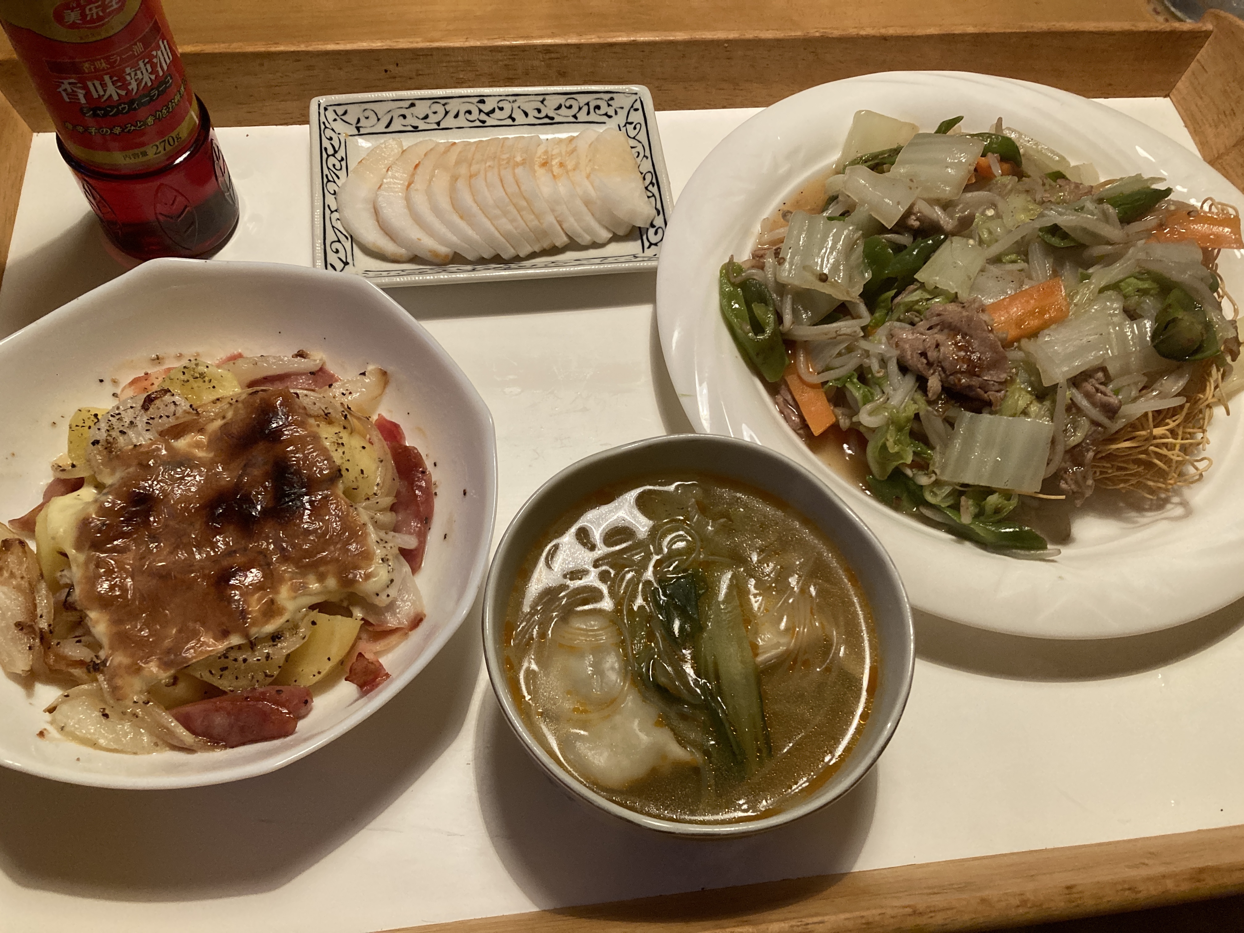 2021年10月20日blogyoko 漬物好き 昨夜も定時にジムへ。 Rさんを見かけましたが、お友達と会話中なので 声はかけずです。 火曜はマシーンの順番を調整し7時にテレビを 見ながらのトレーニング。 時々、夢中になって足が止まる事もしばしば。 コマーシャル時に帰宅。 いつもより遅い時間です。 準備が間に合わず、皿うどんに具材たっぷりの 水餃子、あとは相棒の好きなジャーマンポテトの チーズ焼これだけです。 で、一番美味しかったのは大根の柿漬け。 漬物好きで〜す。