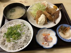 私はアジフライと釜揚げしらす丼。