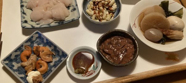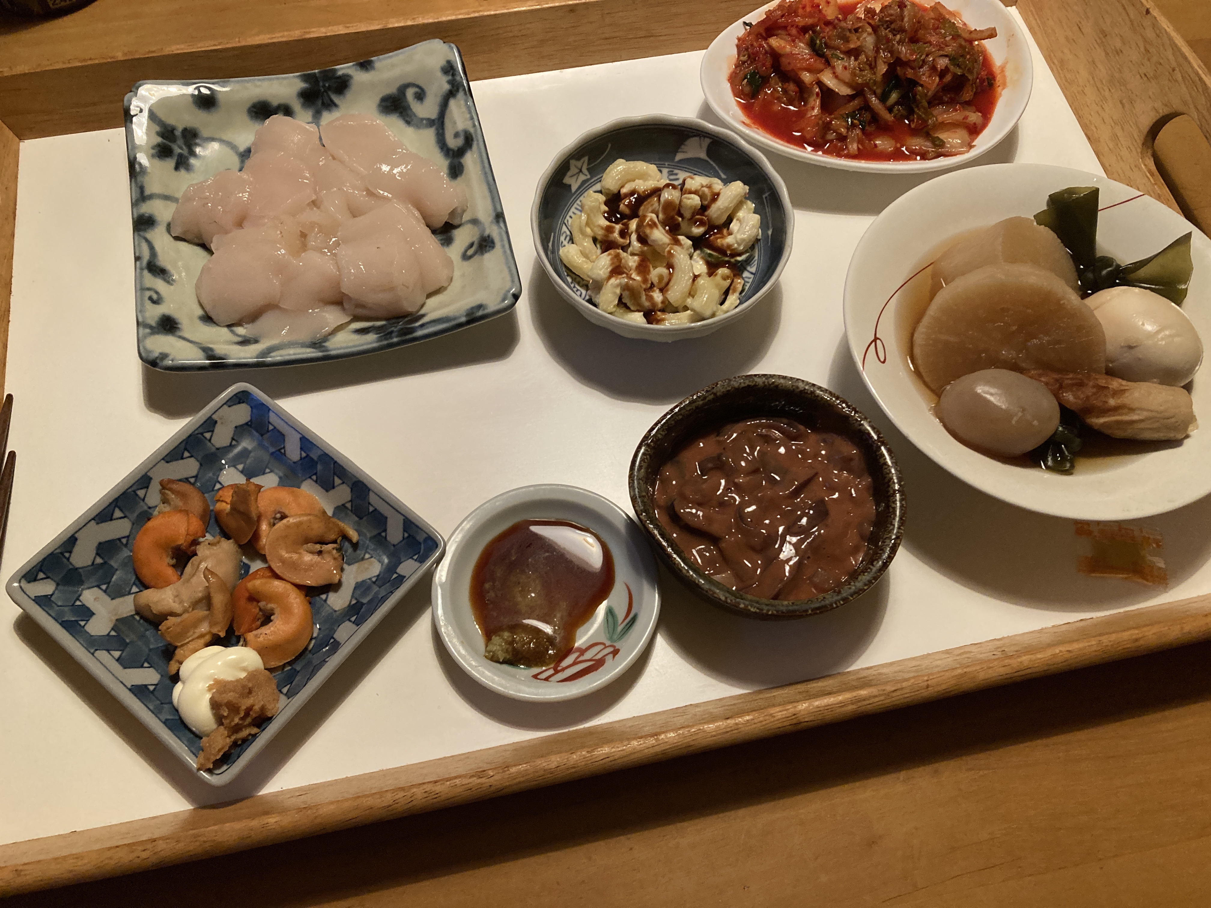 夕食は帆立の刺身と大根のおでん風煮物。
