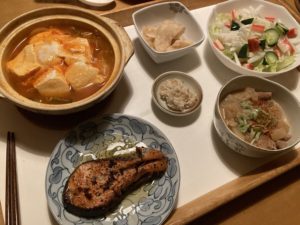 2022年1月26日blogyoko 今夜から 連日ジムへ行っています。 でも、完全に柔軟性&筋力がダウンです。 とにかく無理に力を入れず、まずは体を動かす そんな感じです。 それでも雪がないから行けるだけで満足。 バジル焼きの鮭と海鮮チゲ鍋の夕食。 もつ煮込みも昨夜で在庫がなくなったので 今夜からは1品考えないとで〜す。