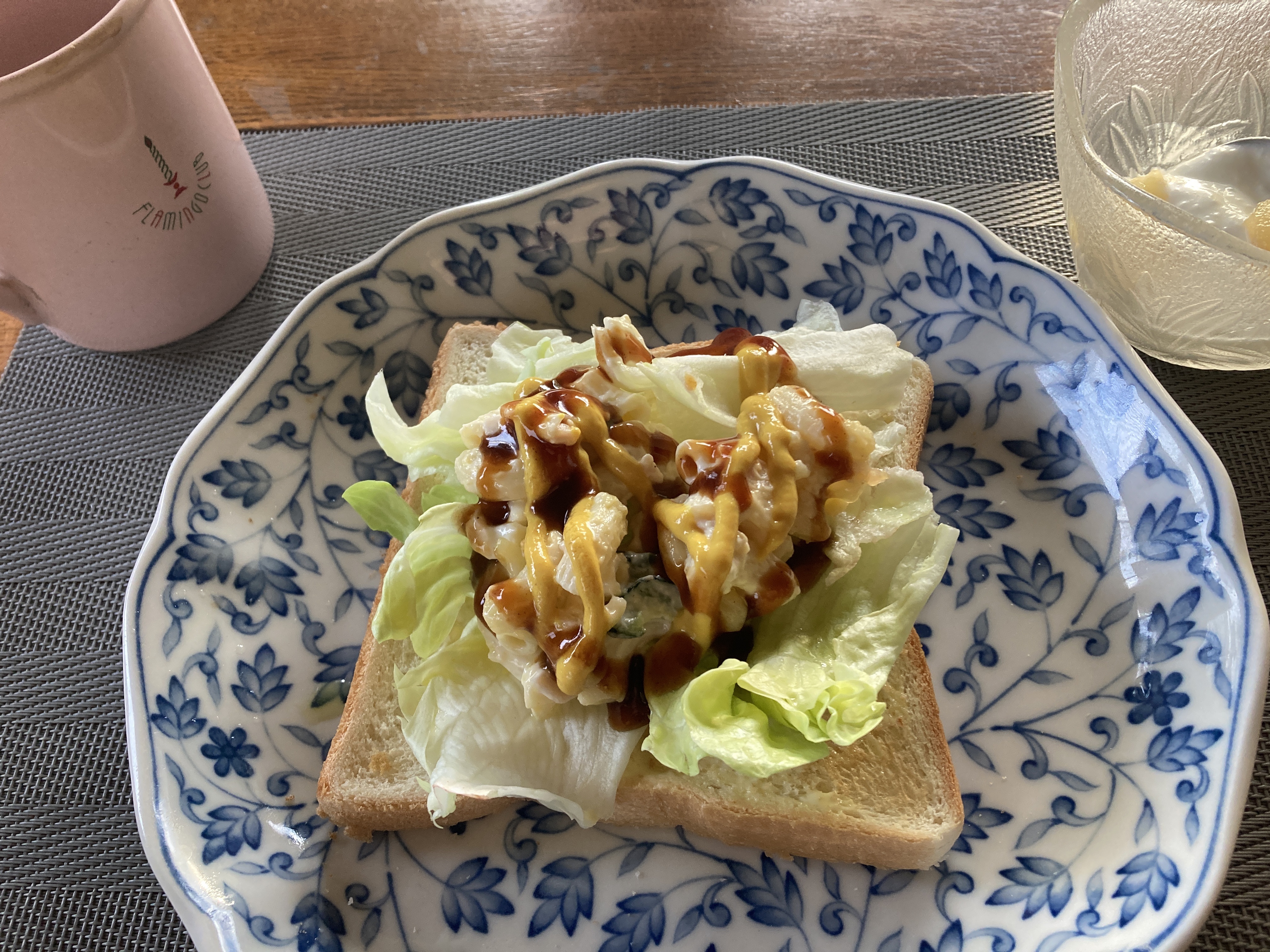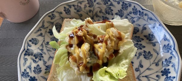 2022年2月9日blogyoko 3分クッキング 洗濯三昧で時間を取り、いつもの朝食の 準備ができません。 私は食パンを焼いてマカロニサラダを のせ、ソースとマスタードをたっぷり。 相棒はお茶漬けの3分クッキングで〜す。