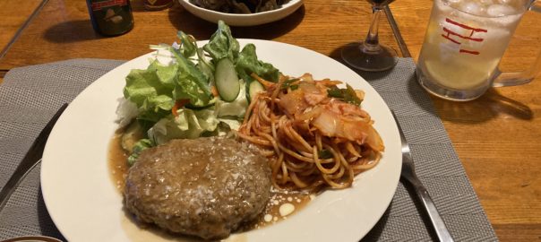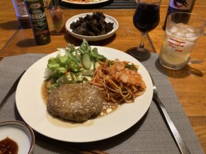 2022年2月17日blogyoko いつもの物に 楽なのでワンプレートの夕食。 野菜を刻んでナポリタンを作っただけ。 ハンバーグはチーンです。 いつもの金のハンバーグではなく別な物に してみました。 かなり食べ応えがります。 相棒は前のハンバーグの方が好き!と。 手作りが一番美味しいですが、動けない時や 時間がない時に活用ですが、いつもの物に 戻しま〜す。