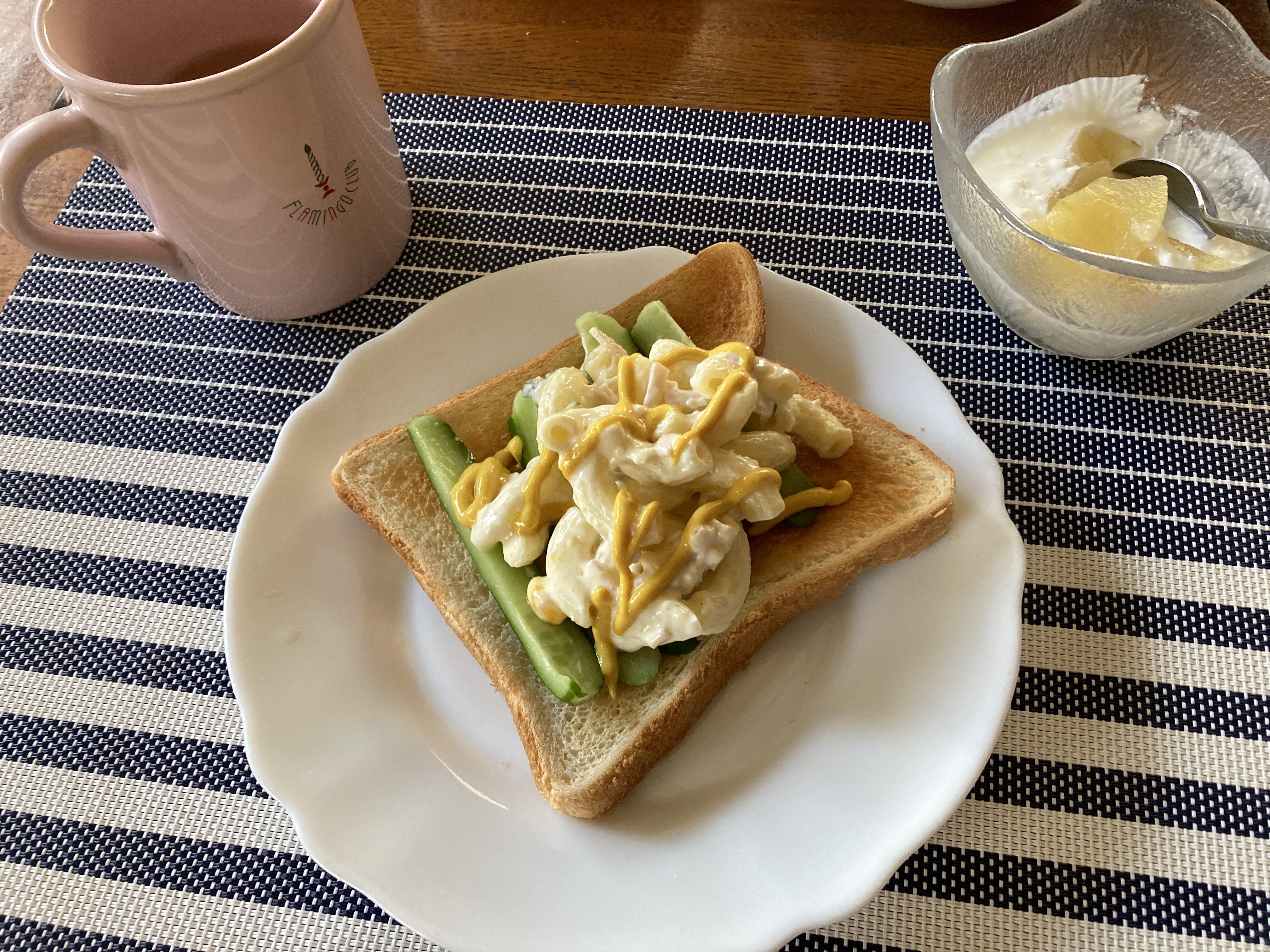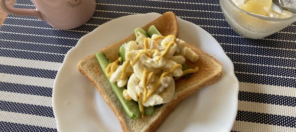 2022年3月25日blogyoko 食欲旺盛 早朝からパタパタでやっと一息つけたのは 朝食時。 台所は甘い、そして少し酸っぱいりんごの 香りが充満です。 相棒は相変わらず白粥ですが、私は マスタードいっぱいかけたパン。 動いた分、食欲旺盛で〜す。