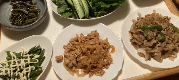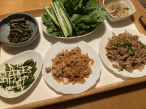 薄い肉を焼肉のタレで味付けしたのとキムチで