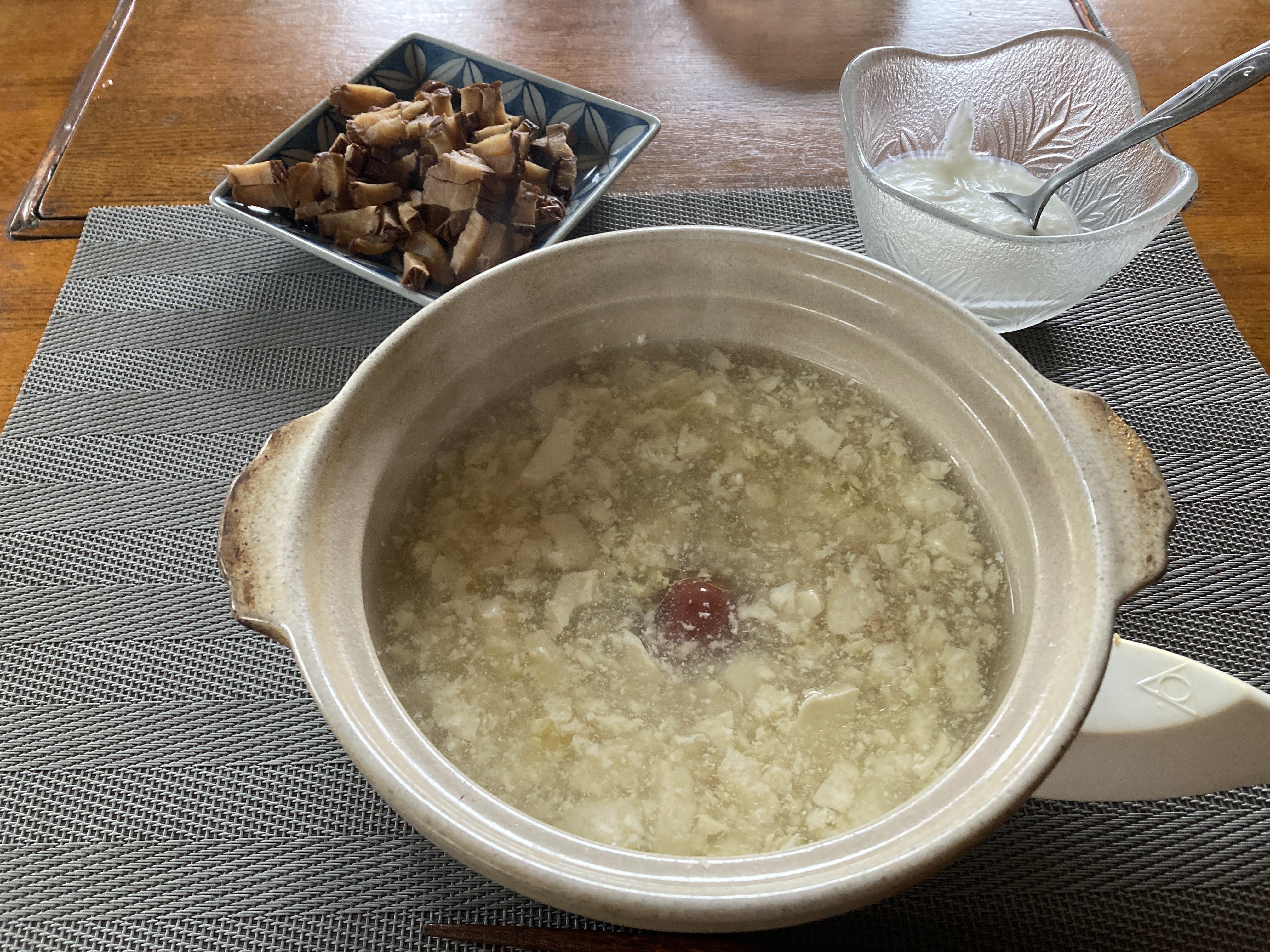 2022年6月8日blogyoko 噛みきれず 今朝は二人で豆腐粥。 豆腐粥と私が勝手に呼んでいるだけですが。 青森のお客様から、たまたま味噌汁代わりに 出たのが豆腐粥。 同じ内容が出たので相棒がビックリした そうです。 青森の郷土食だそうです。 漬物のいぶりがっこは私が食べたくて用意 したけれど二人とも噛みきれず再度細く。 なんかわからない状態で〜す。