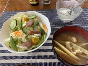 2022年6月27日blogyoko いつもの生活 朝の涼しいうちに二人で畑の予定が 雷雨で中止。 もちろん散歩もなしで、あき時間ばかり。 いつもより早めの朝食です。 サラダと竹の子汁。 また、いつもの生活が始まりま〜す。