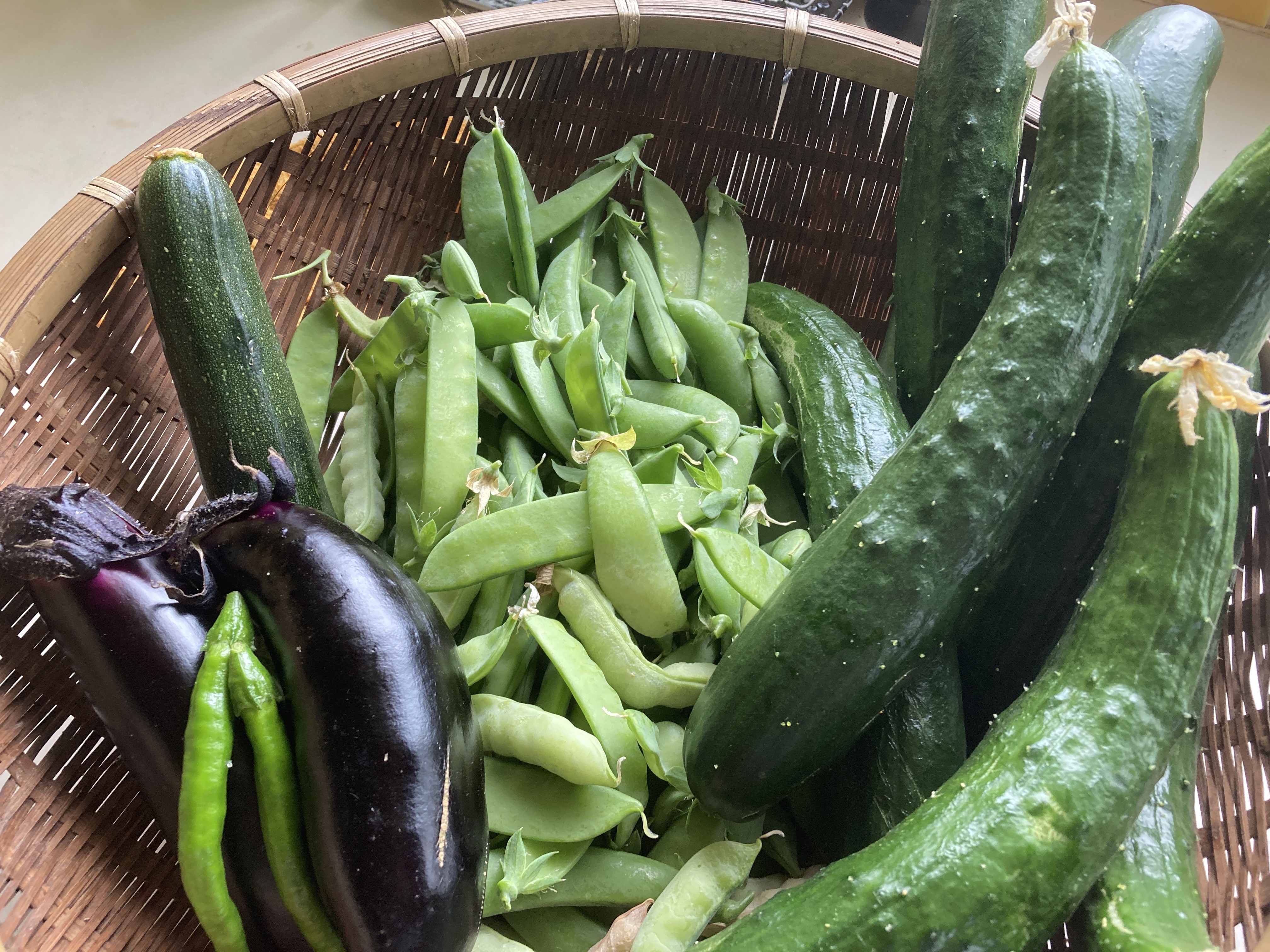 2022年6月23日blogyoko スタッフ分 今日も完全防備で畑へ。 今度はこの花が咲いていました。 スナップエンドウやきゅうり、ズッキーニ、 茄子、そしてまだ若いですが辛い南蛮を2本 だけ収穫です。 収穫した南蛮以外の野菜はスタッフ分で〜す。