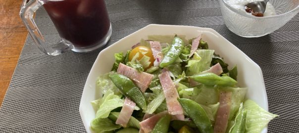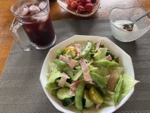 2022年7月8日blogyoko 味変して 探し物を見つけて、洗濯機をまわして 畑へ野菜の収穫。 意外と涼しいけど、パタパタしているから 100%のぶどうジュースで朝食です。 そして、サラダのドレッシングはわさび醤油と オリーブ油。 毎日なので味変して食べていま〜す。